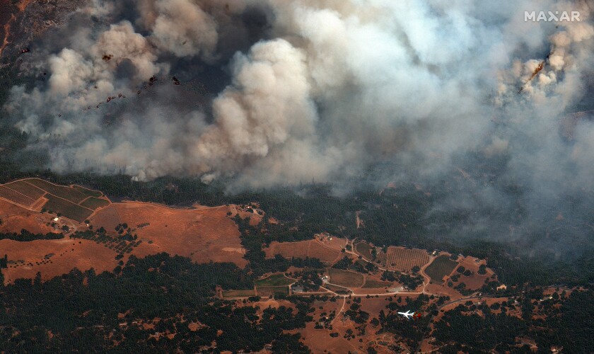 The small community of Grizzly Flats was ordered to evacuate late Monday as a wildfire burning in the El Dorado National Forest 40 miles southwest of Lake Tahoe. As of Thursday night the Caldor fire has reached 68630 acres across El Dorado county. Smoke from the Caldor Fire blankets the shore of South Lake Tahoe.